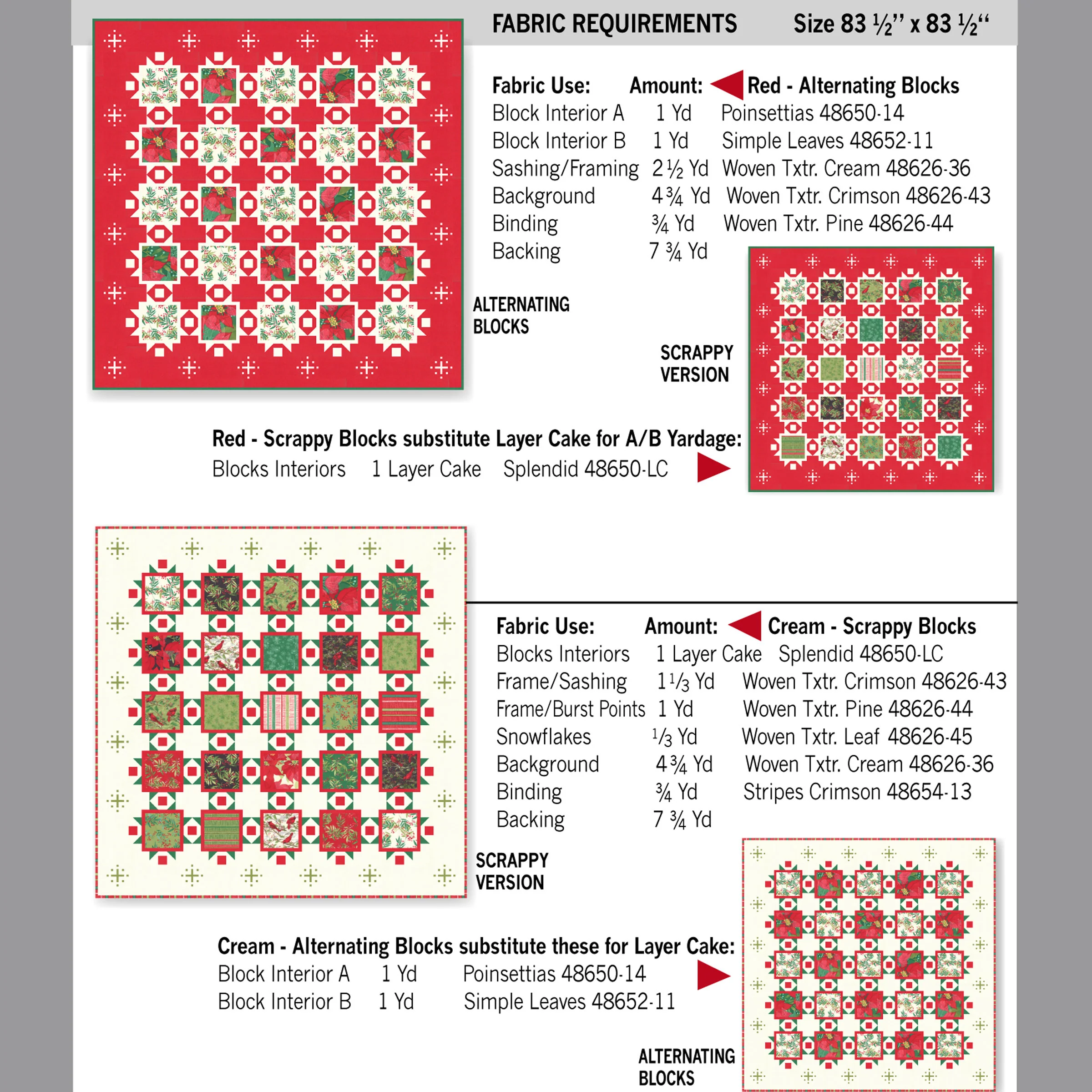 JOY AND DELIGHT is a quilt pattern using decorative frames made from flying geese and little blocks, surrounded by a border of festive snowflakes. A more uniform statement is made with alternating blocks of two print fabrics or you can go for a scrappier look by using a layer cake with a wider variety of fabrics and framing colors. The quilt is sized 83 1/2" x 83 1/2" and is shown in Splendid by Robin Pickens for Moda Fabrics (but can be made with any fabric of your choosing). Snowflakes in the borders are created with joined strips that are subcut into smaller units.
